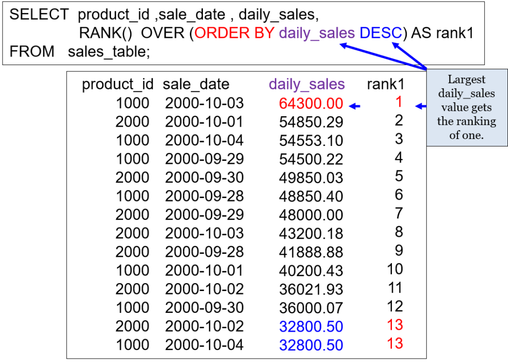 Quite often, a user will want to give the highest value the number one rank. Check out the example below because we are going to use the ORDER BY to rank the daily_sales column in DESC order.