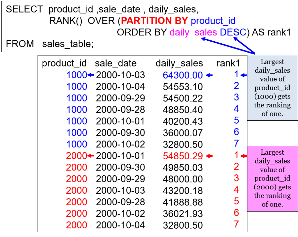 Each RANK example will have an ORDER BY statement, but sometimes you will also have a PARTITION statement. In the example below, you see the keywords PARTITION BY, and that means the RANK function will reset and start the calculation over. Our ORDER BY statement is ordering the data by the column daily_sales DESC, so daily_sales is what we are ranking. Still, we will reset the rank calculation and start over with each product_id break because the column product_id is in the PARTITION BY statement. Check out the next example below.