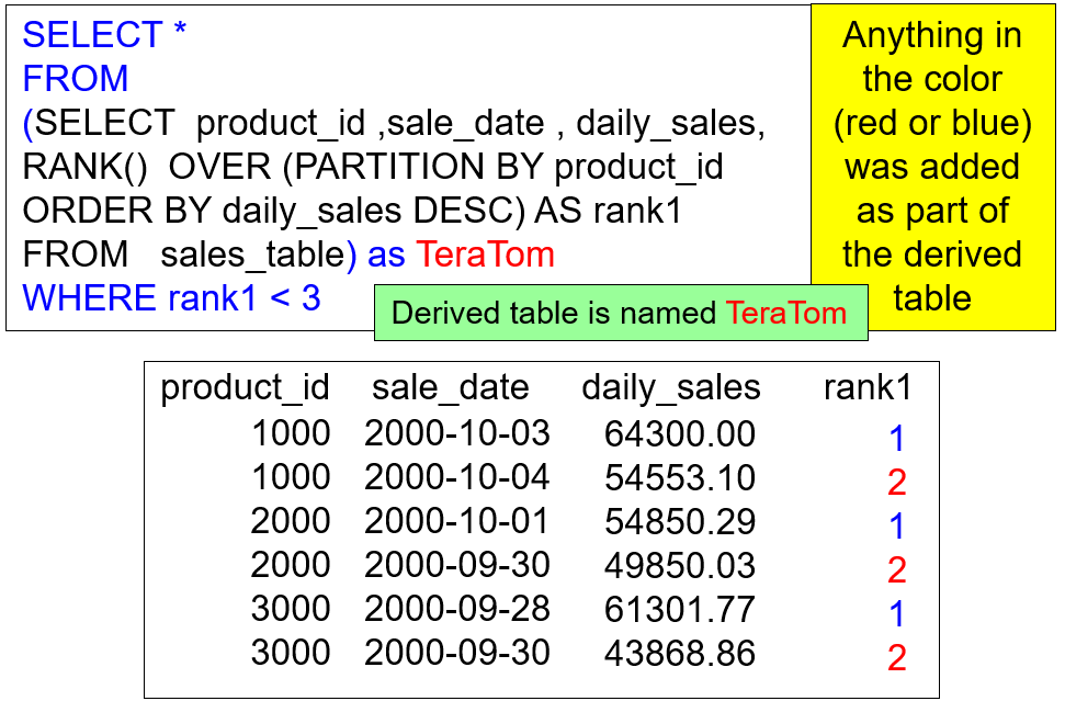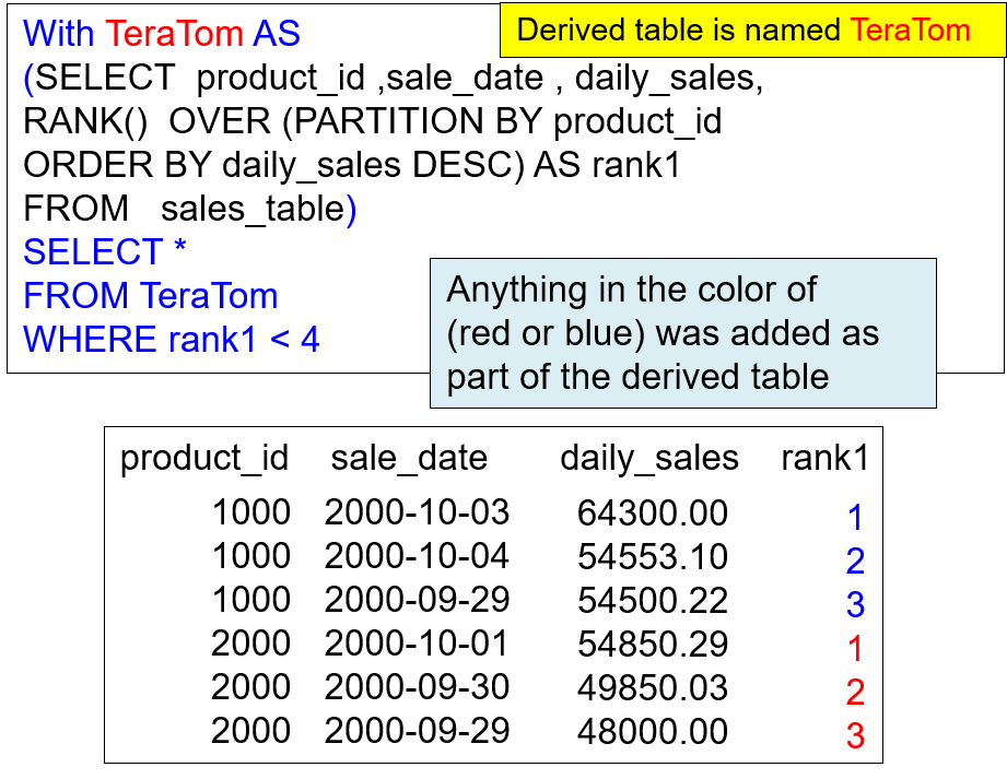 In the next two examples below, we are attempting to find the top two ranking products (daily_sales) for each product_id (1000, 2000, 3000). We build the analytic in a derived table named TeraTom, and then we select from TeraTom. Since the calculations are complete the WHERE clause works.