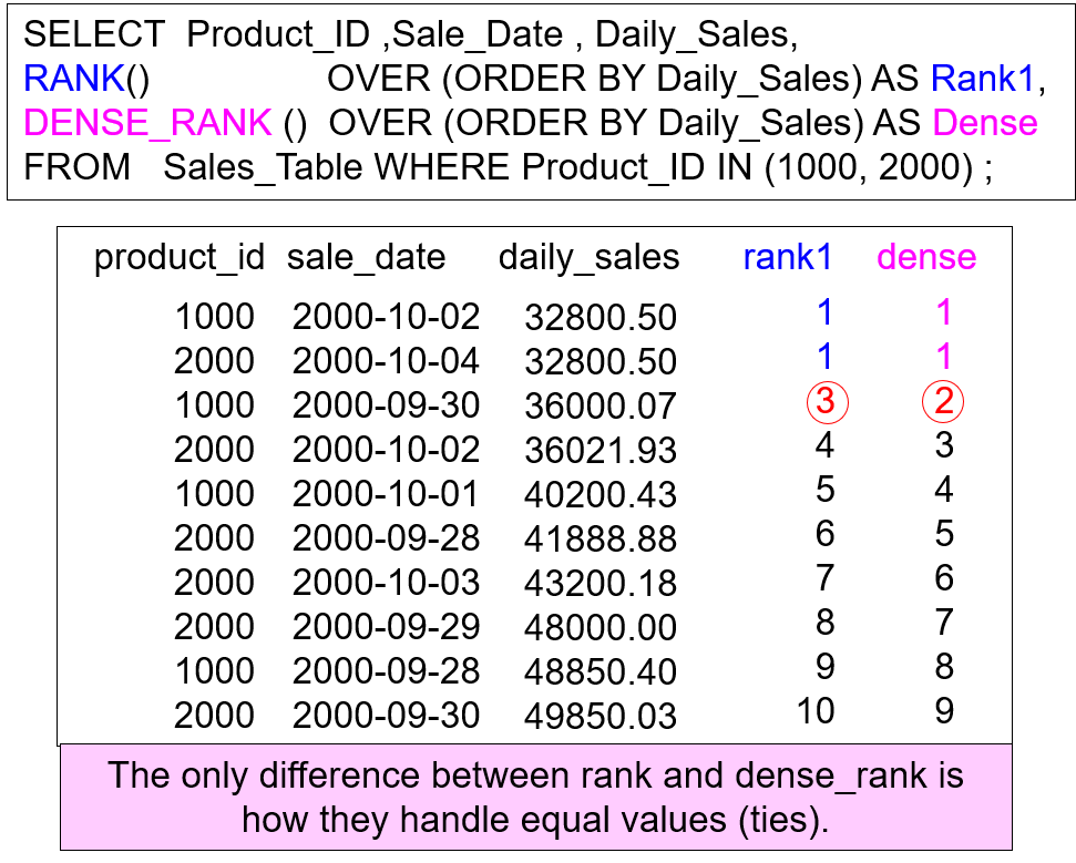 You are about to see something not often seen, and that is the DENSE_RANK. It works exactly like the RANK command, but RANK and DENSE_RANK handle ties differently. In our example below, we are using both the RANK and DENSE_RANK functions. Since both of them have the same ORDER BY daily_sales statement, the data comes out the same, with the only difference being how they handle the ties. The first two rows get a rank of one since they both tie with a value of 32,800.50. The RANK gives the third row a ranking of three, and the DENSE_RANK gives it the third-row a ranking of two.