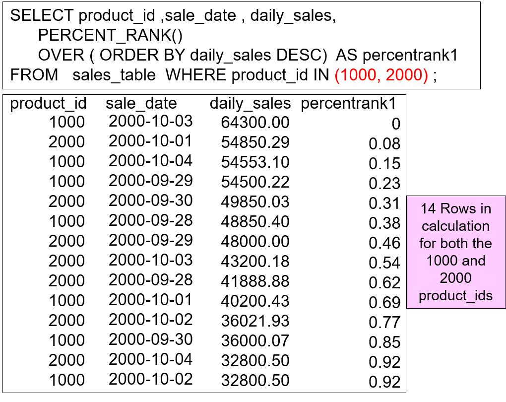 The example below shows the PERCENT_RANK function. Percent_Rank finds out the relative rank of a row in a group. The formula to get Percent_Rank is